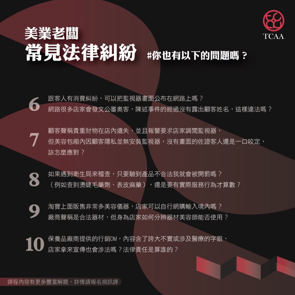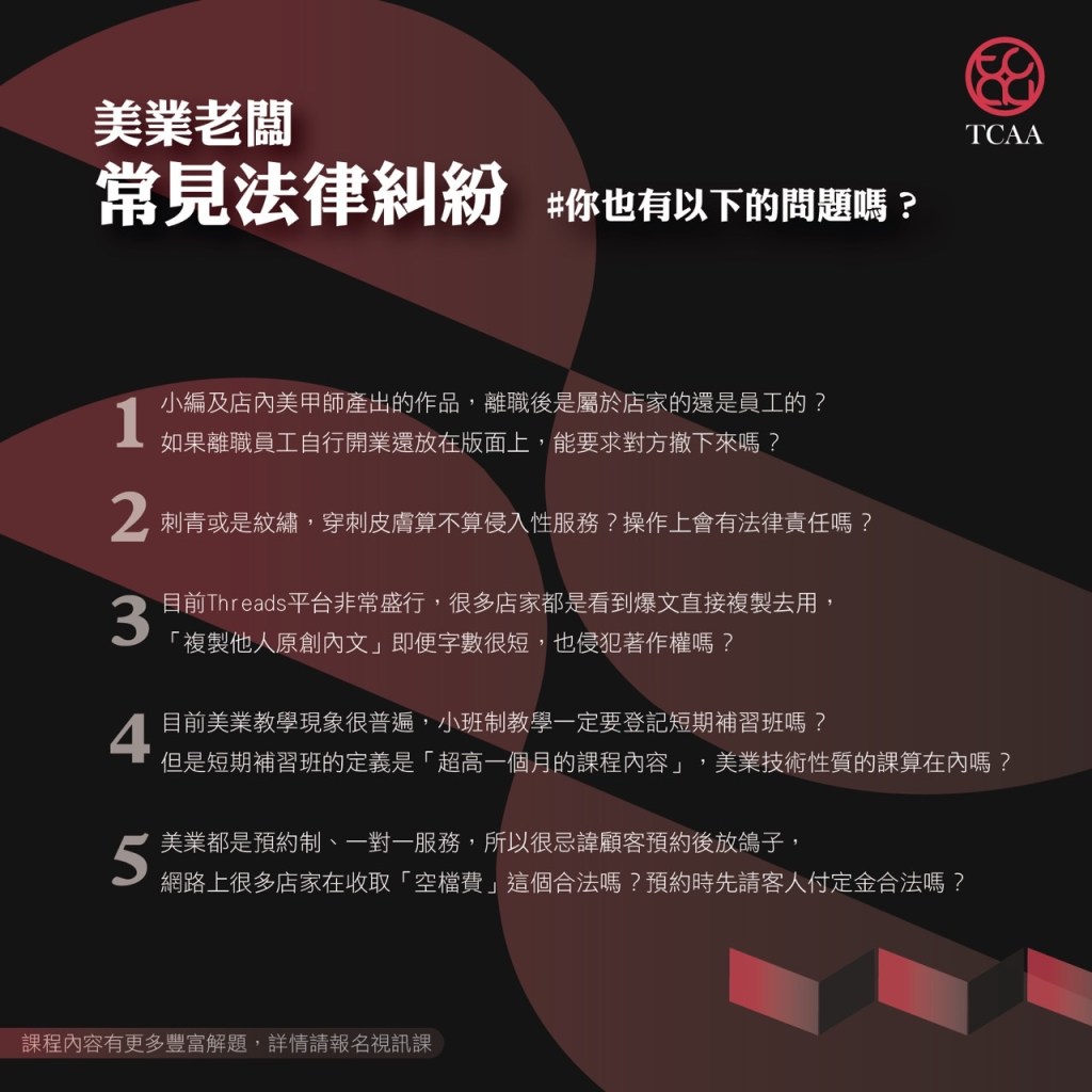 在美業經營現場,老闆每天面對的,不只是顧客、技術、預約和材料,更潛藏著一堆看似無關,卻動輒「踩線」的法律風險。如果你曾懷疑過這些問題到底有沒有法律疑慮——那你絕對不能錯過這堂由協會特聘律師林富郎律師的線上課程!